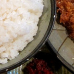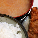 さて、昨日の夕食は軽く食べる程度でした。 12:00近くになって、おなかが鳴り出す。 堪らず、こ〜ゆ〜日こそと、買い物がてらの新宿へ。 郵便局前の路地を入って、さらにもっと細い路地に入って …… あ、残念ながら、値上げの告知が階段横には張ってありますね。 前回の値上げは、2006年8月、 今回の値上げで、とんかつ定食が850円→880円になっています。 しかし、紙かつ定食だけは、相変わらず600円です!。 頼んだ二杯目の御飯は、大盛り!(笑)。 さて、左が問題(←意味不明)の四杯目の豚汁。